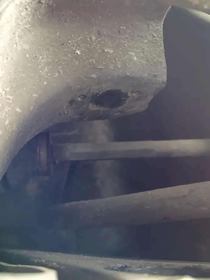 Hier fehlt der Achsbolzen komplett. Der da wohl rausgefallen ist lag im Auto.