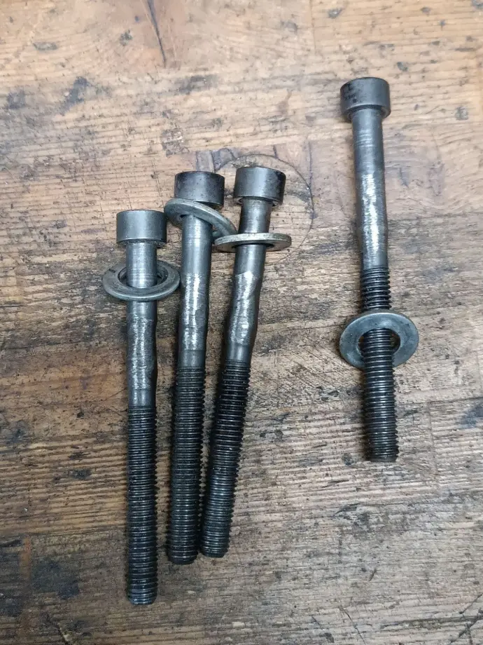 Oberhalb der linken Mutter sieht man die Kratz und Druck Spuren des zu langen Bolzens.