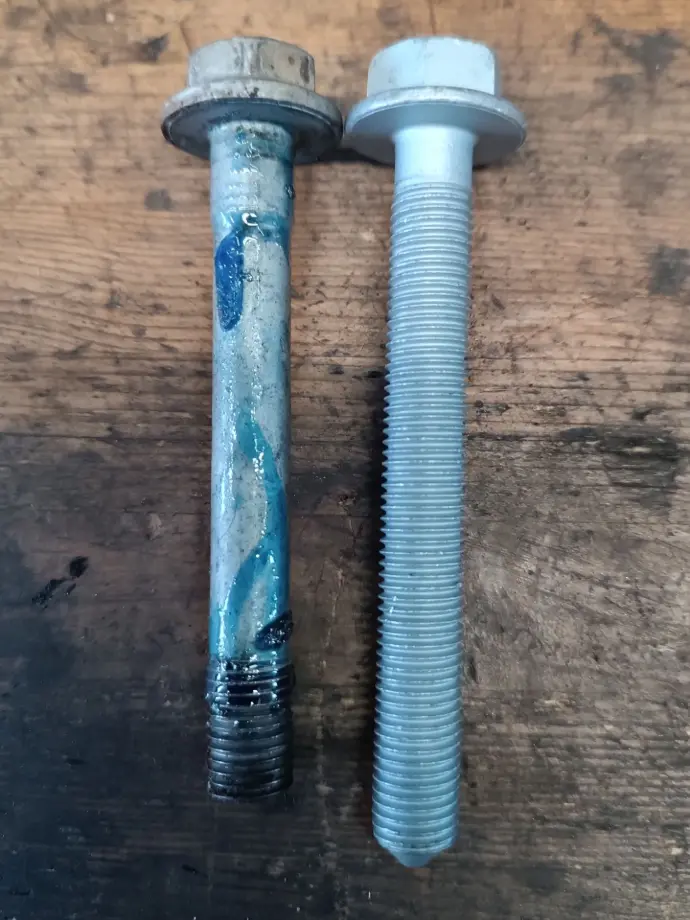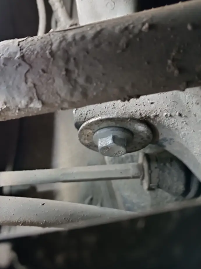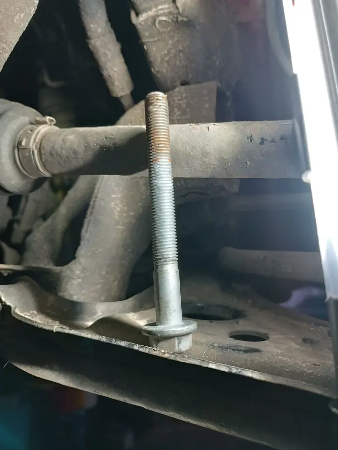 Der verbaute Bolzen ist gekürzt worden und auch die Unterlegscheibe mit einem 17mm Innendurchmesser für einen M12 Bolzen gehört hier nicht hin.