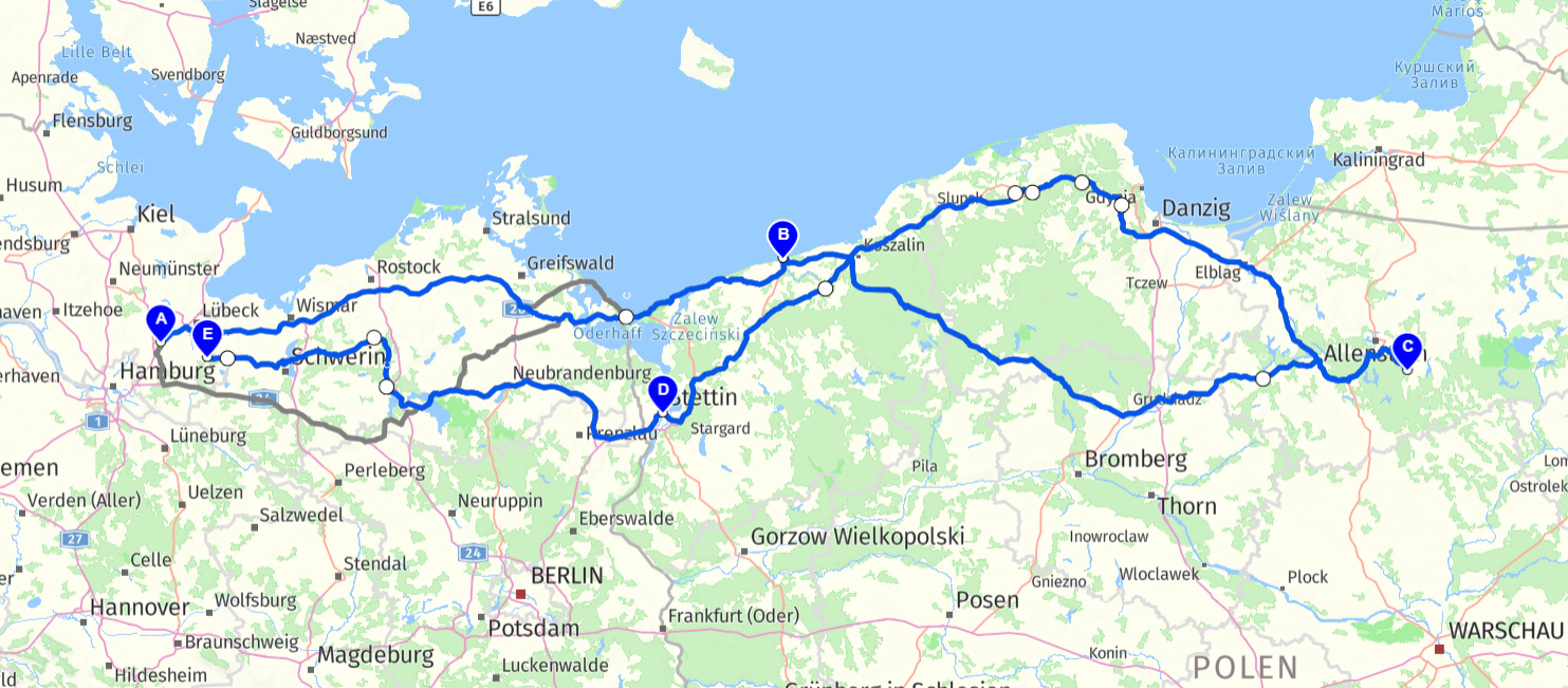 Die Strecke auf diesem Road Trip verläuft entlang der Ostseeküste bis zur Masurischen Seenplatte. Fünf Tage über 1800 km Strecke.